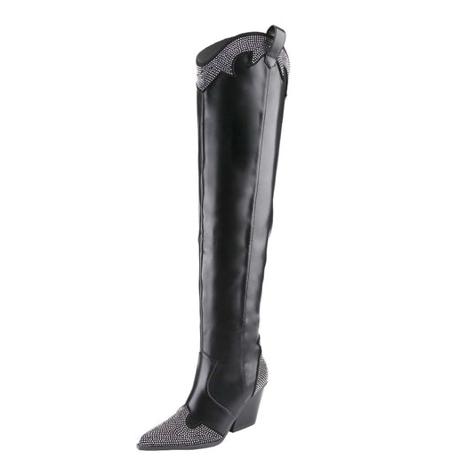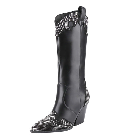 Comfortable Women's Rhinestone Long Boots Western Cowboy Style with Chunky Mid Heel and Pointed Toe
